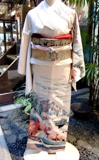 トルソーは風景柄の訪問着に更紗の帯で雰囲気のあるコーディネートです。