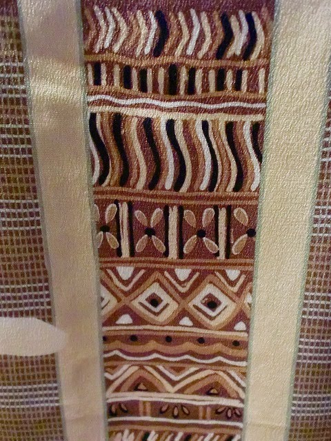 チョコレート色にとけ込むグリーンの組み合わせがかっこいいお着物。