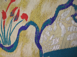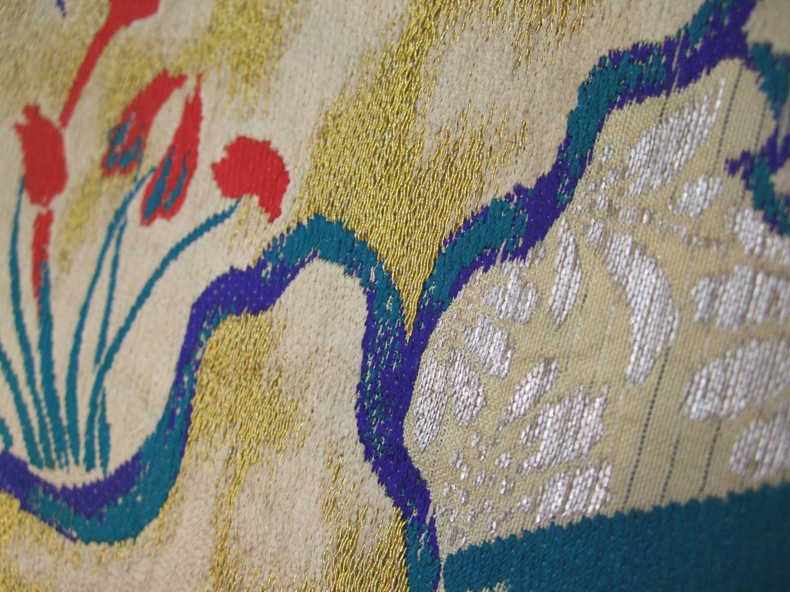 地は市松模様柄、漆糸でなでしこ、桔梗柄がおりだされております。